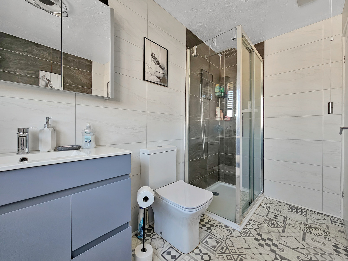 The bathroom is a real highlight. Thoughtfully designed with both a walk-in shower and a bath, modern fitted storage under the basin, a sleek heated towel rail, and stylish tiling throughout, it's a space that feels both luxurious and practical.